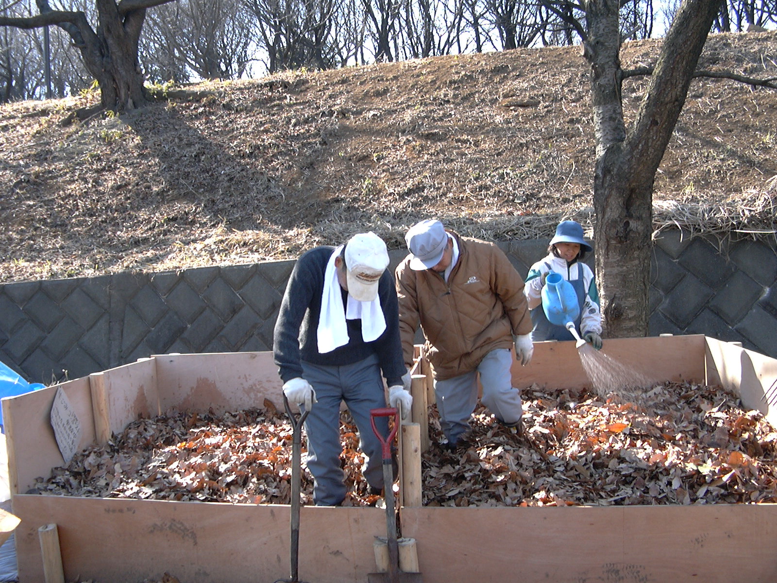 横浜市が各区の環境事業所を通じて貸し出している剪定枝チップ機で作る樹木チップをまぜるのも良い。