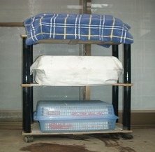 ・ 雨風の時は畳んだダンボール箱で屋根にし、重しを乗せる。ぬれても乾燥は早い。
